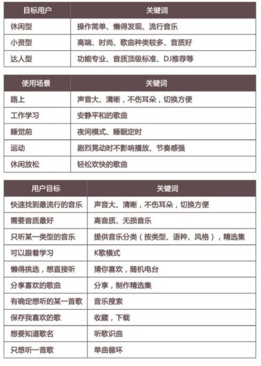 使用场景:上班路上/工作学习/睡觉前/运动/休闲放松用户目标:需要音质最好/只听某一个类型的音乐份享喜欢的歌曲/保存喜欢的歌/想知道某首歌曲的歌名……