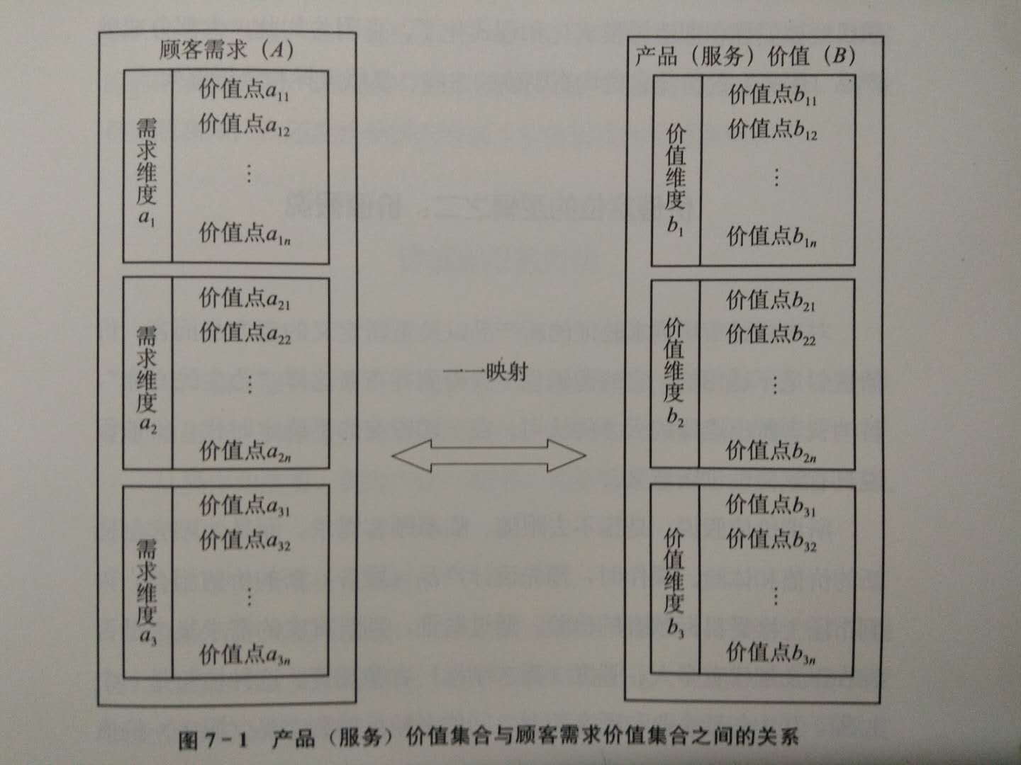 我们可以把顾客需求定义为A集合,产品(服务)所提供的价值定义为B集合,A集合和B集合中有多个元素--价值点。B集合中的每个价值点都是对A集合中每个价值点的体认、理解、临摹和追随,顾客需求的价值点是产品(服务)价值点的原象价值定位基础和依据),显然,两个集合之间存在一一映射的关系(见图7-1)。